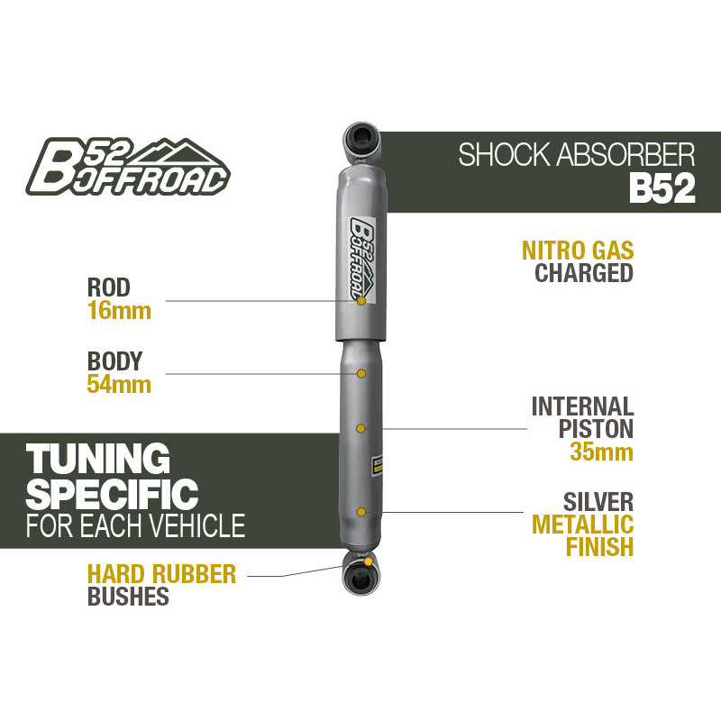 AMORTISSEURS b52 offraod , azote gazeux sous pression LES AVANTAGES DES AMORTISSEURS B52 : -l'azote gazeux à basse pression réduit considérablement la probabilité d'aération de l'huile et de décoloration par choc -Diamètre du corps de 54 mm -Piston 35mm -tige 16mm -bagues en caoutchouc à haute résistance -Montages soudés par fusion et soudés supplémentaires pour une résistance et une fiabilité maximales -spécialement valve pour chaque application de véhicule POUR NISSAN PICK UP D22 arriere (POUR rehausse +5CM )