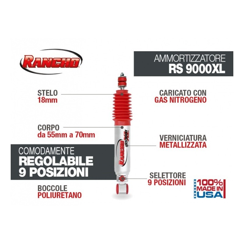 La possibilité de réglage du Rancho® RS9000XL ™ offre les performances de neuf amortisseurs intégrés dans un boîtier très flexible. La technologie de réglage Rancho® MyRide ™ vous permet de sélectionner neuf niveaux différents de performance ou de qualité de conduite, pour une adaptation rapide à toutes les conditions de conduite. Construit avec un corps d'amortisseur massif, l'amortisseur RS9000XL ™ offre à la fois performance et apparence à votre camion et à votre VUS. Grande tige de 18 mm * De 55 à 70 mm de diamètre * Technologie de réglage à 9 positionsForgé métallique d'azote Fini métallique liquideBoulets en polyuréthaneBotte de protection incluse