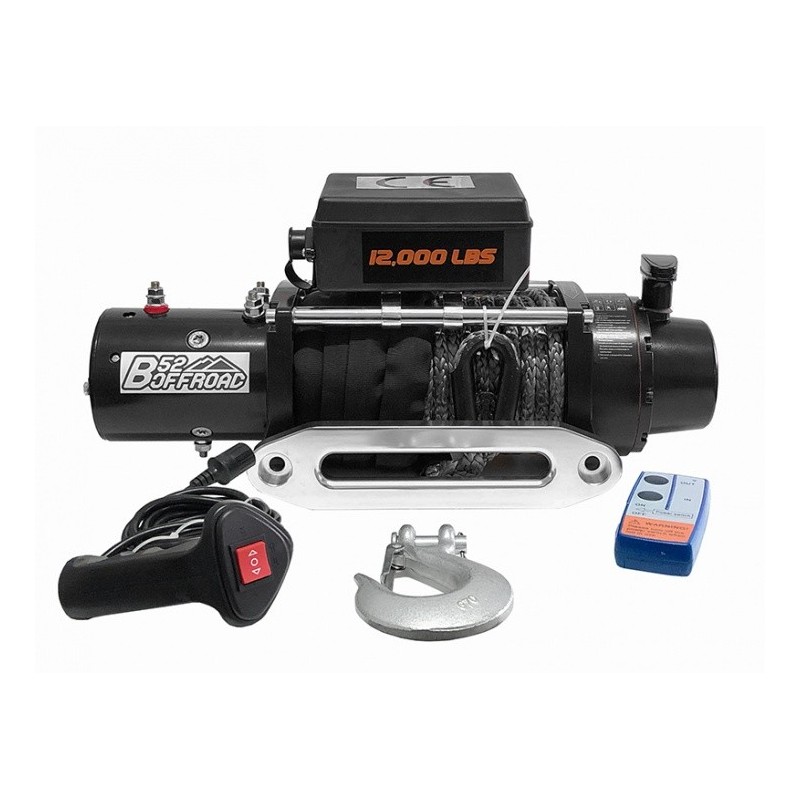 Treuil B52 OFFROAD 12000 12V, capacité 5 000 kg (12 000 lb), moteur de 6,0 cv, livré avec câble, câble et guide-câble dyneema sk75 de 11 mm, avec télécommande filaire et télécommande radio incorporée. Conformité CE. Côté compact et faible poids.